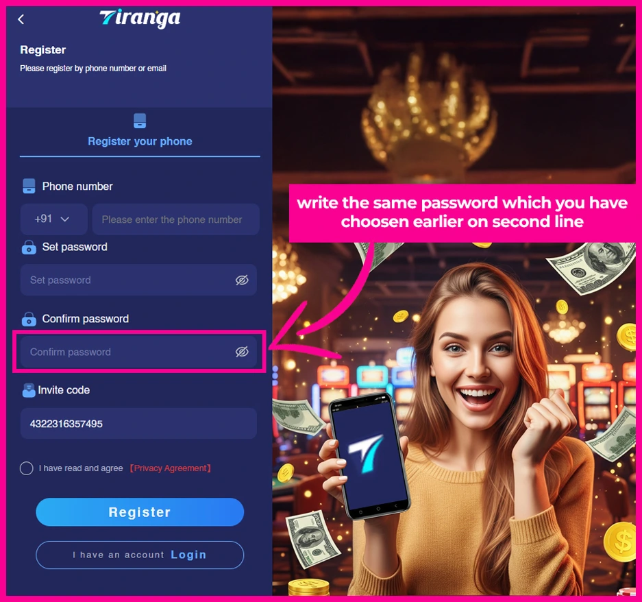Follow these easy steps to register yourself on the Tiranga platform and start exploring the games and entertainment options: